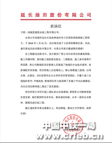 近日,延長油田股份有限公司工程管理部向中鐵一局建安公司延長石油魚種場住宅小區(qū)消防系統(tǒng)維修工程項目發(fā)來表揚信,對項目管理團隊迎難而上完成目標(biāo)任務(wù)的優(yōu)異表現(xiàn)給予肯定和表揚!