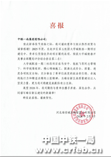 近日,河北雄安城發(fā)域智置業(yè)有限公司特發(fā)喜報,對中鐵一局起步區(qū)第五組團(tuán)大學(xué)城配套一期二標(biāo)段項目在2025年度業(yè)主單位履約評價中獲得綜合排名第二名表示祝賀,對項目團(tuán)隊高效卓越的履約能力與精益求精的工匠精神給予肯定。