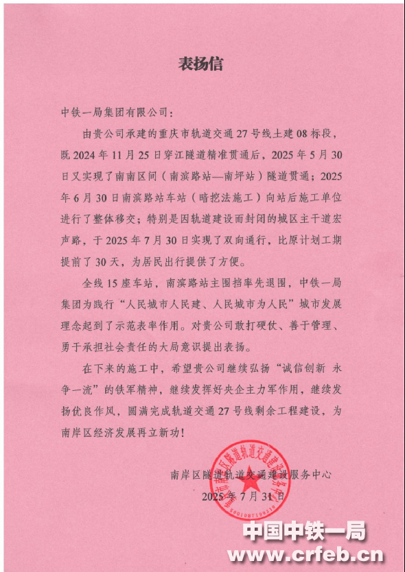 重慶市南岸區隧道軌道交通建設服務中心在發來的表揚信中,對項目建設中展現出的優良作風和突出貢獻給予了高度評價,特別指出南濱路站主圍擋率先退圍及宏聲路提前通車,是項目團隊“誠信創新 永爭一流”鐵軍精神的集中體現。