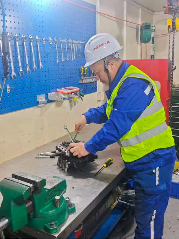 2021年至2024年,熊建兵在宜興鐵路六工區負責三臂鑿巖臺車及其他大型施工機械的日常維護與應急搶修工作。面對這類集液壓、電控、智能導航于一體的高精尖設備,許多青年技工望而卻步,而年近五旬的熊建兵卻迎難而上。白天,他堅守在維修崗位一線,對臺車、空壓機、挖機等設備進行細致檢修、潤滑保養和故障排除,確保每臺機械以最佳狀態投入施工;晚上回到宿舍,他則埋頭鉆研設備圖紙,系統學習電路控制、液壓原理及智能化系統相關書籍,常常伏案至深夜。憑借多年積累的機械直覺和扎實功底,并總結出“早預判、快響應、精修復”的維護模式。在他的精心保障下,六工區施工掌子面開挖平均每循環所需時間比其他工區縮短了兩個小時,顯著提升了整體掘進效率。