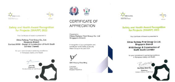 2019年,三公司成功叩開標準嚴苛的新加坡市場,中標南北走廊N108項目,實現(xiàn)了在國際高端工程領(lǐng)域從“零”到“一”的重大突破。項目實施期間,團隊自主完成地連墻及鋼支撐等關(guān)鍵工序,憑借卓越的工程質(zhì)量與安全管理,2023年、2024年連續(xù)榮獲新加坡人力部頒發(fā)的“職業(yè)健康與安全先鋒獎”,2024年、2025年連續(xù)兩年蟬聯(lián)新加坡警察部隊“安全管理榮譽證書”,充分彰顯了企業(yè)在高端市場的卓越品牌影響力與技術(shù)創(chuàng)新實力。