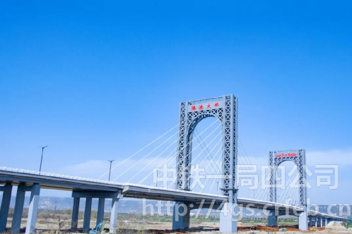 寶雞陸港大橋是寶雞市渭河上高度最高、寬度最寬、跨度最大的城市橋梁,全長(zhǎng)1272米,橋梁上跨南北河堤路、渭河及連霍高速,為雙向八車道,設(shè)計(jì)時(shí)速每小時(shí)60公里。主橋?yàn)殡p塔雙索面鋼箱梁斜拉橋,跨徑布置為(102+208+102)米,大橋橫梁整體提升重量大、同步控制要求高、定位精調(diào)難度大、空中懸停時(shí)間長(zhǎng)、施工組織和技術(shù)要求高。門式鋼桁架主塔提升施工工藝應(yīng)用于格構(gòu)式鋼塔斜拉橋塔頂拱形橫梁的施工屬國(guó)內(nèi)首次,項(xiàng)目榮獲2020年度“中國(guó)中鐵杯”優(yōu)質(zhì)工程。