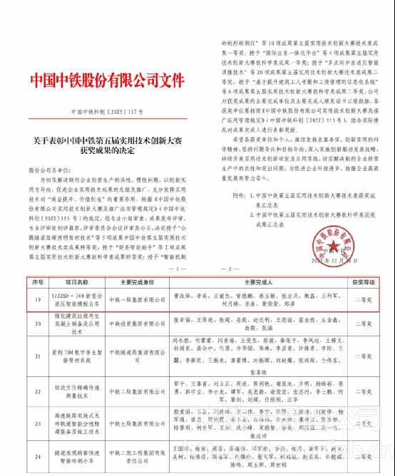 近日,中國中鐵公布了第五屆實用技術創新大賽獲獎名單,由公司主持完成的《YJZZSD-300 新型全液壓智能模板臺車實用技術》憑借突出的創新性、實用性及應用價值,成功斬獲技術類二等獎,這也是公司在該項賽事中首次獲獎,標志著其在隧道施工智能化裝備研發領域取得重要突破,為深化“一局質建”品牌建設注入強勁動能。