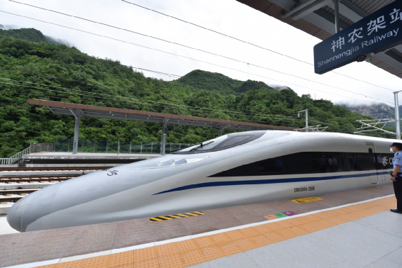 鄭渝高鐵全線開通儀式后,停靠在神農(nóng)架站的第一輛和諧號動車