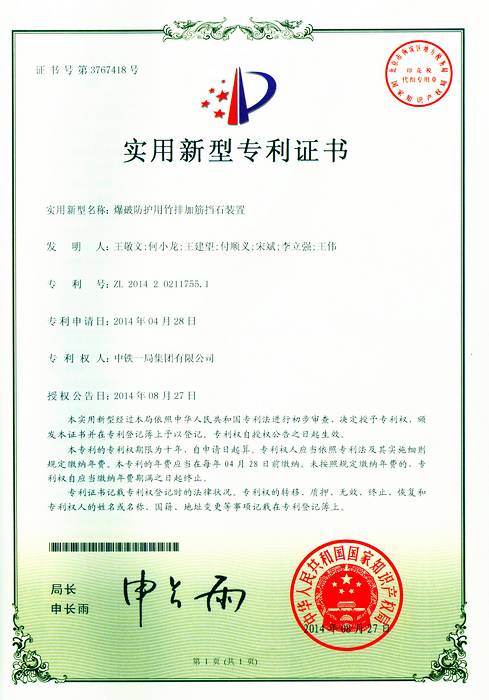 浙江杭州訊:近日,紫之隧道項目部申報的《爆破防護用竹排加筋擋石裝置》專利在國家知識產權局受理后已通過審查,獲得實用新型專利證書。
