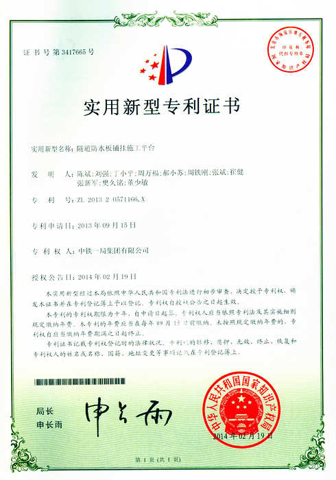 寧夏隆德訊 近日,六盤山隧道申報的《隧道防水板鋪掛施工平臺》專利在國家知識產權局受理后已通過審查,獲得實用新型專利證書。