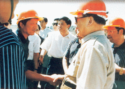 江澤民總書記視察中鐵一局修建南疆鐵路工程時,與員工親切握手交談
