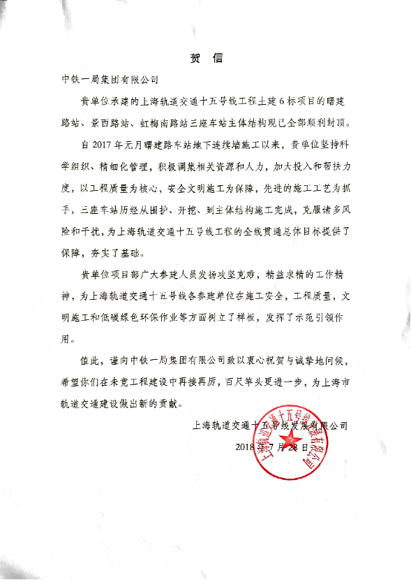 7月28日,上海軌道交通十五號線發(fā)展有限公司向公司發(fā)來賀信,祝賀公司承建的上海軌道交通15號線工程土建6標(biāo)項(xiàng)目曙建路站、景西路站、虹梅南路站三座車站主體結(jié)構(gòu)全部順利封頂,為上海軌道交通十五號線工程的全線貫通總體目標(biāo)提供了保障。
