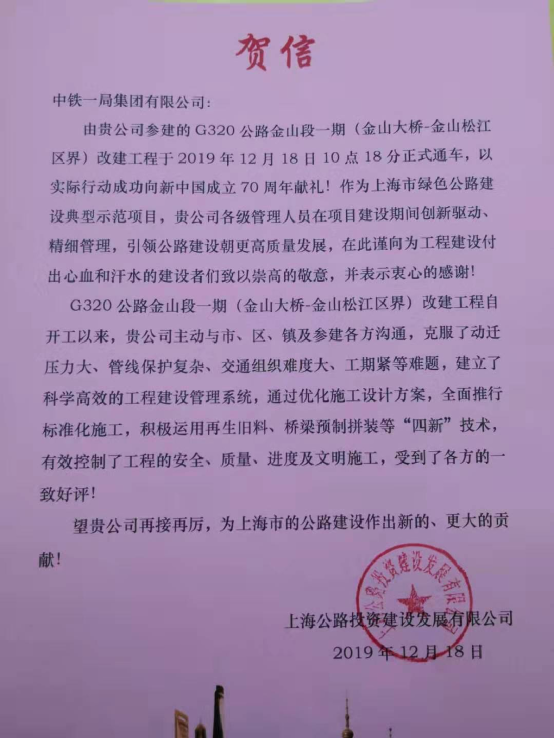 12月18日,G320公路(金山大橋~金山松江區(qū)界)改建工程通車儀式在中鐵一局G320JSI-2標(biāo)張涇橋順利舉行。當(dāng)天,上海公路投資建設(shè)發(fā)展有限公司向中鐵一局發(fā)來賀信。