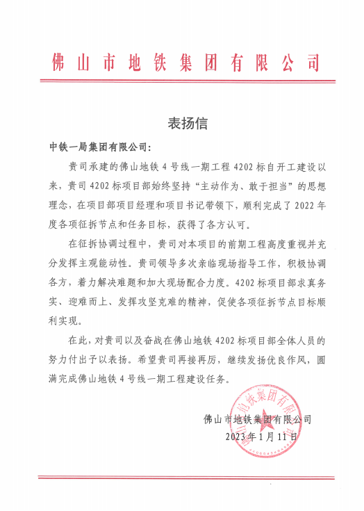 近日,由中鐵一局承建的佛山地鐵3203-1標(通車)、佛山地鐵4號線4202標項目(在建)傳來捷報。佛山3號線項目榮獲“首通段開通初期運營突出貢獻獎優秀施工單位”“首通段2022年度檔案管理優秀單位”“首通段開通初期運營先進集體和先進個人”等榮譽;佛山4號線圓滿完成了2022年度各項征拆節點和任務目標,獲得各方認可,收到佛山地鐵集團表揚信。