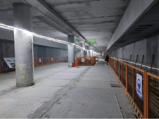 步入南門站的地下車站,只見主體結(jié)構(gòu)已經(jīng)完成,工人們正在進(jìn)行一些收尾工作。沿著車站細(xì)細(xì)查看,整個(gè)站內(nèi)側(cè)墻、柱子表面平滑如鏡,清水混凝土展現(xiàn)著頗具特色的“工業(yè)風(fēng)”。