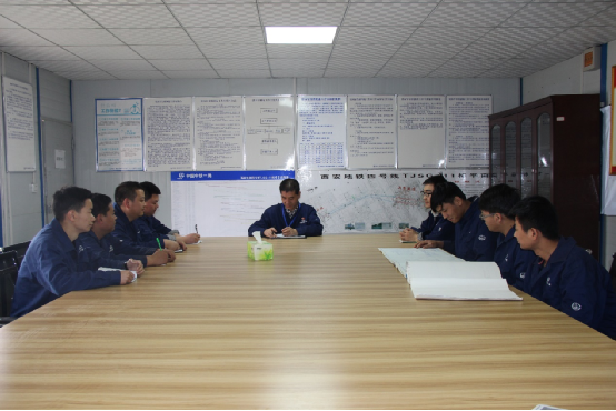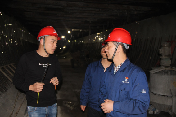 9點20分,梁西軍在北豎井和副經理探討如何加快施工進度。他善于激發大家創新思維,為加快施工進度出謀劃策。