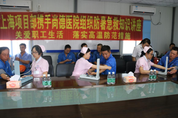 上海訊:通訊員 樊靜 李瓊會  近期上海持續(xù)高溫,最高溫度達40℃。天氣酷熱難耐,施工現(xiàn)場一線參建員工的安全作業(yè)是項目部關注的重點。為落實高溫防范措施,抓好員工生產(chǎn)生活保障,關愛員工身心健康,7月29日下午,上海9號線10標項目工會邀請上海尚德醫(yī)院醫(yī)務科科長、體檢中心主任、急救示范護士共6名醫(yī)務人員為項目部員工開展夏季防暑急救知識講座并進行現(xiàn)場體檢。