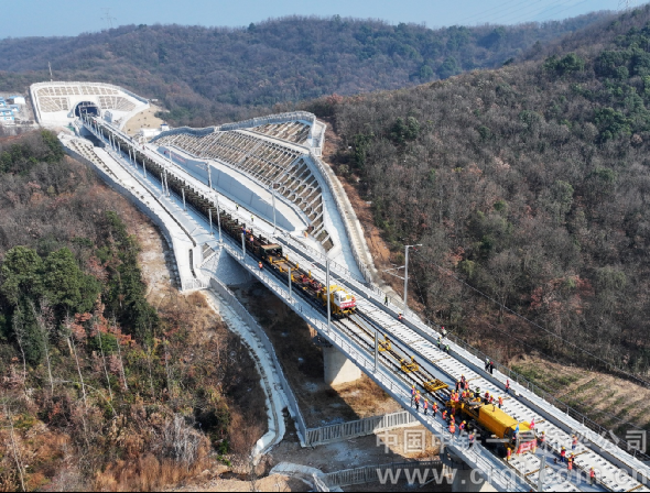 昌九高鐵尖山嶺隧道鋪軌施工現場鋪軌車開始鋪軌