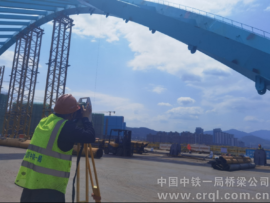 施工中,中鐵一局項目團隊堅持“高精度、高效率”施工標準,有序推進主副拱支架卸載、支座鎖定、系桿張拉、吊桿張拉及主梁支架拆除五個環節。系桿、吊桿安裝前,技術人員采用測繩、全站儀等多種形式對吊桿長度進行測量、復核,實現吊桿生產合格率100%;支座灌漿前,試驗室提前對灌漿料各項性能指標進行檢測,以保證灌漿密實、強度達標;預應力施工中,項目積極聯合監控及監理單位,安裝張拉全工序管控,張拉過程中統一指揮,嚴格遵循力值與伸長量雙控的原則,對稱鋼束兩端同步分級張拉,最終數據均在誤差允許范圍內。