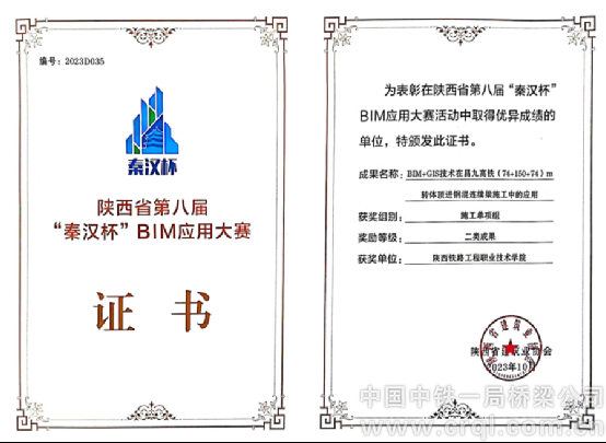 施工中19次跨越鐵路、高速與水庫,每一次跨越都是對技術與安全管控的嚴峻考驗。跨杭瑞高速特大橋施工中,創新采用國內首創的“自驅動輪軌式小車大縱坡馱運縱移+豎向千斤頂吊掛系統整體下放”工法,以16臺小車組成“運輸矩陣”完成過孔作業,借BIM技術實現鋼箱梁誤差毫米級控制,工效較傳統工法提升10倍,相關BIM應用成果榮獲“新城建杯”一等獎、“秦漢杯”二類成果獎,為同類工程提供寶貴經驗。