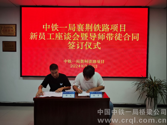 9月9日,中鐵一局襄荊鐵路項目組織召開新員工座談會暨導師帶徒簽約儀式,項目部和各工區領導班子、導師以及13位新員工參加。