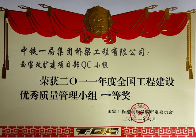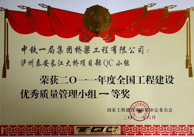 由橋梁工程公司選送參評的西安至寶雞高速公路改擴建工程阿房宮高架橋《提高樁基后壓漿合格率》和瀘州泰安長江大橋《研究大型塔吊高空拆除新方法》兩項成果,在與762項成果角逐中脫穎而出,經(jīng)國家工程建設(shè)質(zhì)量獎審定委員會審定,分別獲得2011年度全國工程建筑優(yōu)秀質(zhì)量管理小組一等獎。西寶項目部選送的《提高樁基后壓漿合格率》更是以小組第三名的優(yōu)異成績直接進入了中國質(zhì)量協(xié)會全國優(yōu)秀質(zhì)量管理獎的評審,并最終斬獲全國工程建設(shè)優(yōu)秀質(zhì)量管理小組一等獎的桂冠。