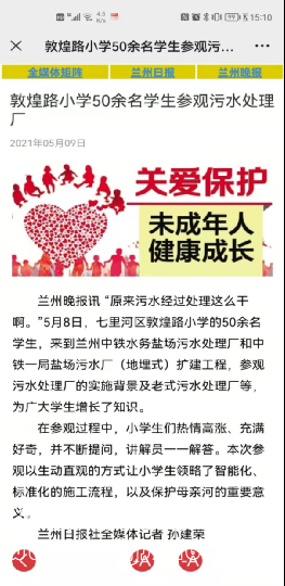 5月8日至11日,學(xué)習(xí)強(qiáng)國、蘭州日報、甘肅省電視臺經(jīng)濟(jì)頻道、蘭州晨報、蘭州晚報、每日甘肅網(wǎng)等8家媒體對蘭州鹽場污水處理廠項目接受敦煌路教育集團(tuán)“紅領(lǐng)巾尋訪”系列主題教育實踐活動進(jìn)行報道。