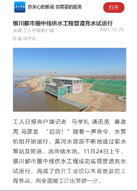 11月26日,新華社、工人日報、學(xué)習(xí)強(qiáng)國、新華網(wǎng)、人民網(wǎng)、中工網(wǎng)、寧夏電視臺、寧夏日報、寧夏新聞網(wǎng)、寧夏財經(jīng)網(wǎng)等11家媒體對銀川都市圈中線供水項目成功通水試運(yùn)行進(jìn)行報道。