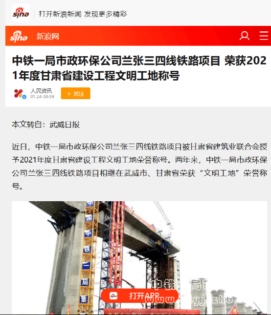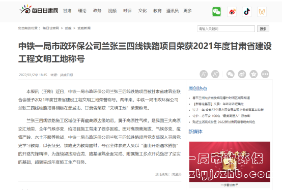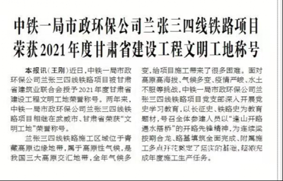 武威日?qǐng)?bào)報(bào)道:中鐵一局市政環(huán)保公司蘭張三四線鐵路項(xiàng)目榮獲2021年度甘肅省建設(shè)工程文明工地稱號(hào)。