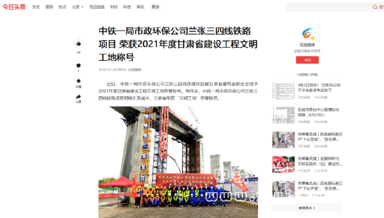 今日頭條報(bào)道:中鐵一局市政環(huán)保公司蘭張三四線鐵路項(xiàng)目榮獲2021年度甘肅省建設(shè)工程文明工地稱號(hào)。