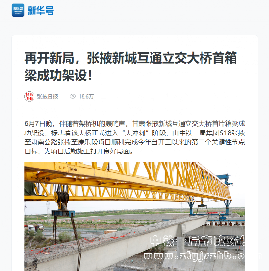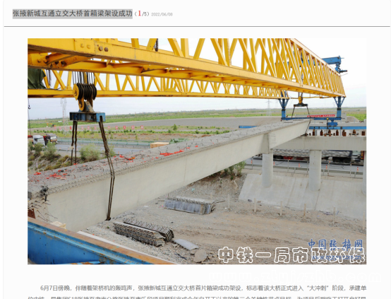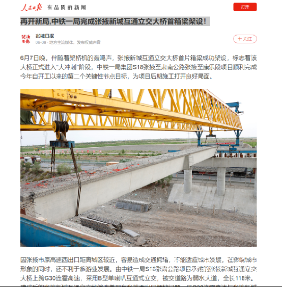 6月9日,人民日報報道:再開新局,中鐵一局完成張掖新城互通立交大橋首箱梁架設(shè)!