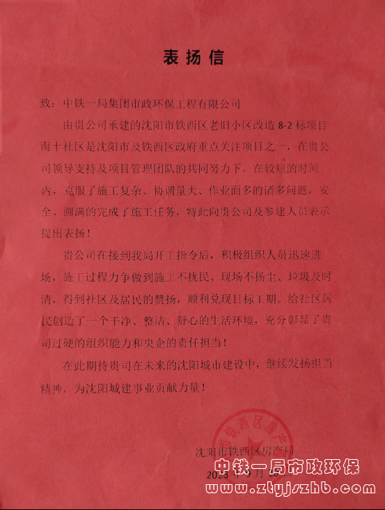 表揚信中指出:項目部在較短的時間內,克服了施工復雜、協調量大、作業面多的諸多困難,圓滿完成了施工任務,在施工過程中做到了施工不擾民、現場不揚塵、垃圾及時清,給社區居民創造了一個干凈、整潔、舒心的生活環境,充分彰顯了過硬的組織能力和央企的責任擔當。