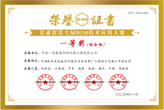 BIM技術在武威涼州城區污水處理廠工程設計及施工中的應用成果,榮獲中國市政工程協會舉辦的2024年第六屆“市政杯”BIM應用技能大賽二類成果及2024年甘肅省第七屆BIM技術應用大賽一等獎。BIM技術在蕭山錢江超大型地埋式污水處理廠設計及施工中的應用成果,榮獲第五屆工程建設行業BIM大賽三等成果。BIM技術在蘭州鹽場污水處理廠項目設計及施工中的應用成果,榮獲2024年甘肅省第七屆BIM技術應用大賽二等獎。