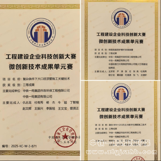 在微創新賽道上,《灌漿套筒裝配式橋梁四柱墩高精度拼裝技術研究與工程應用》成果取得一等成果,《融合BIM+GIS的土方數字化調配施工技術》《復雜條件下大口徑頂管施工關鍵技術》《鐵路路基防護柵欄安裝裝置研發與應用》成果取得三等成果。