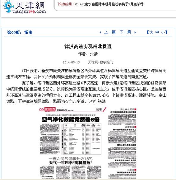 《城市快報》、天津網—津濱高速實現南北貫通