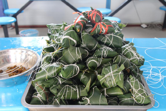 包粽子初,大家都躍躍欲試,信心滿滿,一個包下來發(fā)現(xiàn),不是米漏出來就是線綁不好,大家的技術(shù)水平參差不齊,不過無論是技術(shù)嫻熟還是新手上路大家都特別開心,食堂里洋溢著歡聲笑語。經(jīng)過大家的辛勤勞作,上百個形態(tài)各異的粽子完成了,濃香的粽子味道飄滿整個食堂!