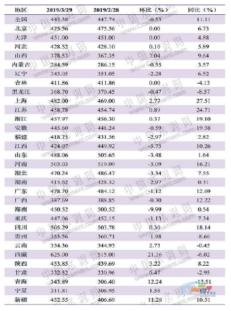 2019年3月末,全國(guó)P.O42.5散裝水泥均價(jià)為445.38元/噸,環(huán)比微跌-0.53%,同比漲幅為11.11%。本月價(jià)格環(huán)比上漲的?。ㄊ校┯?3 個(gè),漲幅最大的是西藏地區(qū),環(huán)比大漲21.36%;價(jià)格環(huán)比下跌的省(市)有15 個(gè),其中海南跌幅最大,環(huán)比下滑了9.99%;其余3個(gè)省(市)價(jià)格行情無變動(dòng)。