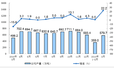 據(jù)國(guó)家統(tǒng)計(jì)局?jǐn)?shù)據(jù),2019年3月份,全國(guó)規(guī)模以上工業(yè)企業(yè)生產(chǎn)水泥17971萬噸,同比大增22.2%。1-3月累計(jì),生產(chǎn)水泥39160萬噸,同比增長(zhǎng)9.4%。3月份,全國(guó)水泥日均產(chǎn)量579.7萬噸,同比減少81.5萬噸,降幅16.4%;環(huán)比增長(zhǎng)220.7萬噸,增幅61.5%。